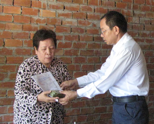 Phó Chủ tịch Hội CTĐ tỉnh - Hồ Văn Cưng trao tiền hỗ trợ từ chương trình “Vượt qua hiểm nghèo” tại huyện Vĩnh Hưng