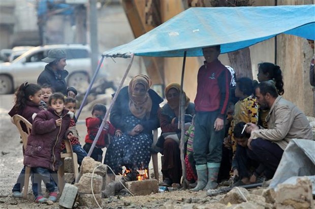 Người dân đốt lửa sưởi ấm trong thời tiết giá lạnh do bị mất nhà cửa sau trận động đất tại Jindayris, Syria, ngày 7/2/2023. (Ảnh: AFP/TTXVN)