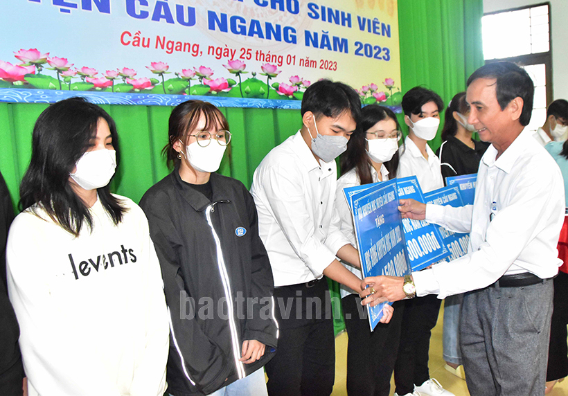 Đồng chí Nguyễn Văn Ngà, Chủ tịch UBND huyện Cầu Ngang trao học bổng cho sinh viên.