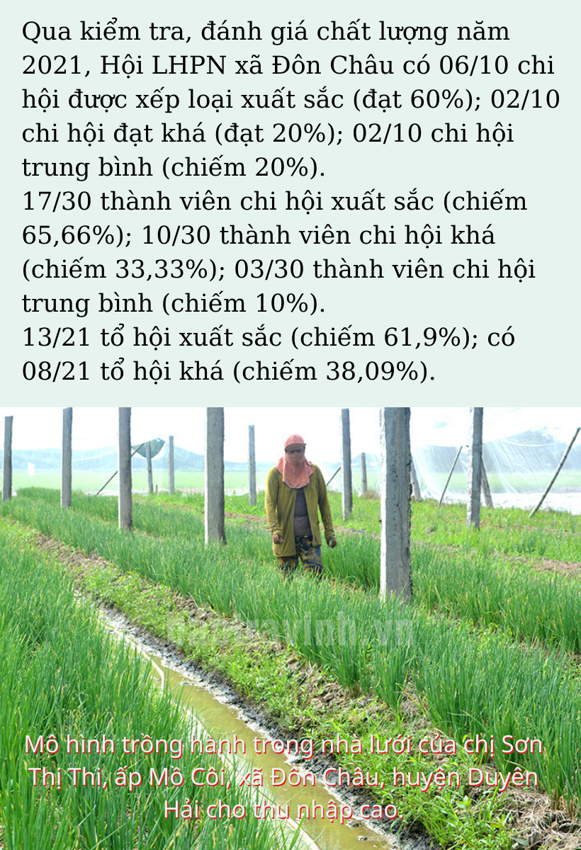 Hội LHPN xã Đôn Châu có 10 chi hội, tổng số phụ nữ từ 18 tuổi trở lên có 3.654 người, trong đó, có 2.023 là người Khmer, chiếm 55,36% so phụ nữ từ 18 tuổi trở lên; tổng số 1.870 hội viên phụ nữ, đạt tỷ lệ 51,30%. Đa phần gia đình hội viên sinh sống chủ yếu bằng nghề sản xuất nông nghiệp, một phần mua bán nhỏ. Một số hộ hội viên còn khó khăn. Từ thực tế trên, Hội LHPN xã đặc biệt quan tâm, tạo điều kiện cho hội viên phát triển kinh tế hộ. Từ đó, Hội triển khai nhiều giải pháp thiết thực, giúp đỡ hội viên thay đổi nếp nghĩ, cách làm mới, sáng tạo trong sản xuất, kinh doanh vươn lên trong cuộc sống.
