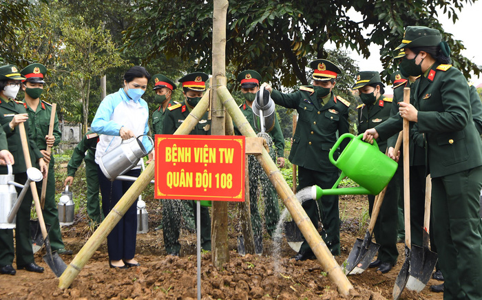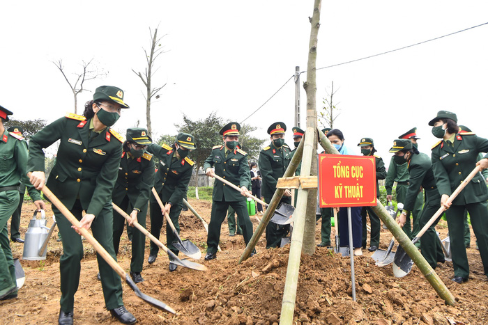 | Các đại biểu cùng cán bộ, hội viên phụ nữ trong quân đội tham gia trồng cây - Ảnh: Hải Vân |