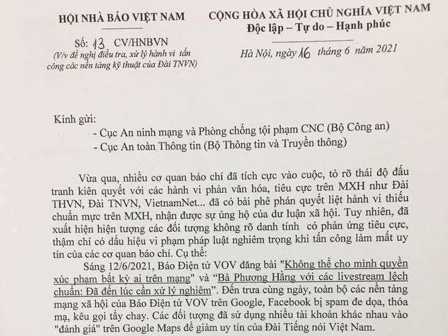Công văn của Hội Nhà báo Việt Nam nêu rõ: Vừa qua, nhiều cơ quan báo chí đã tích cực vào cuộc, tỏ rõ thái độ đấu tranh kiên quyết với các hành vi phản văn hóa, tiêu cực trên mạng xã hội, như VOV, VTV, VietnamNet... đã có bài phê phán quyết liệt hành vi thiếu chuẩn mực trên mạng xã hội, nhận được sự ủng hộ của dư luận xã hội. Tuy nhiên, đã xuất hiện hiện tượng các đối tượng không rõ danh tính có phản ứng tiêu cực, thậm chí có dấu hiệu vi phạm pháp luật nghiêm trọng khi tấn công làm mất uy tín của các cơ quan báo chí.