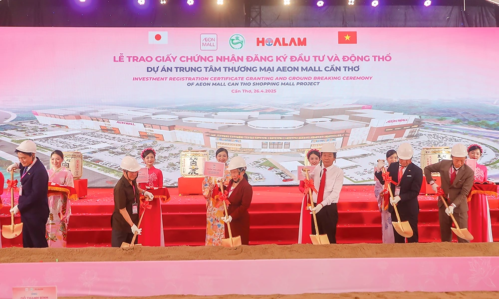 Các đại biểu thực hiện nghi thức động thổ Dự án trung tâm thương mại AEON Mall Cần Thơ.