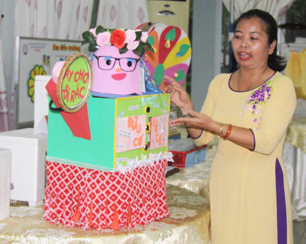 Giáo viên thuyết minh về mô hình thùng rác thân thiện