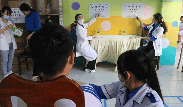 Các y, bác sĩ trẻ thuộc Chi đoàn cơ sở Bệnh viện Mắt - Răng Hàm Mặt Cần Thơ tham gia chương trình tư vấn, khám bệnh về mắt miễn phí cho thiếu nhi quận Ninh Kiều.