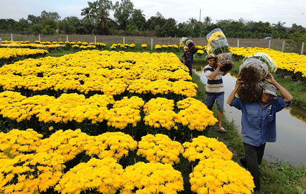 Thương lái thu mua hoa của nông dân tại phường Thới An Đông, quận Bình Thủy, TP Cần Thơ.