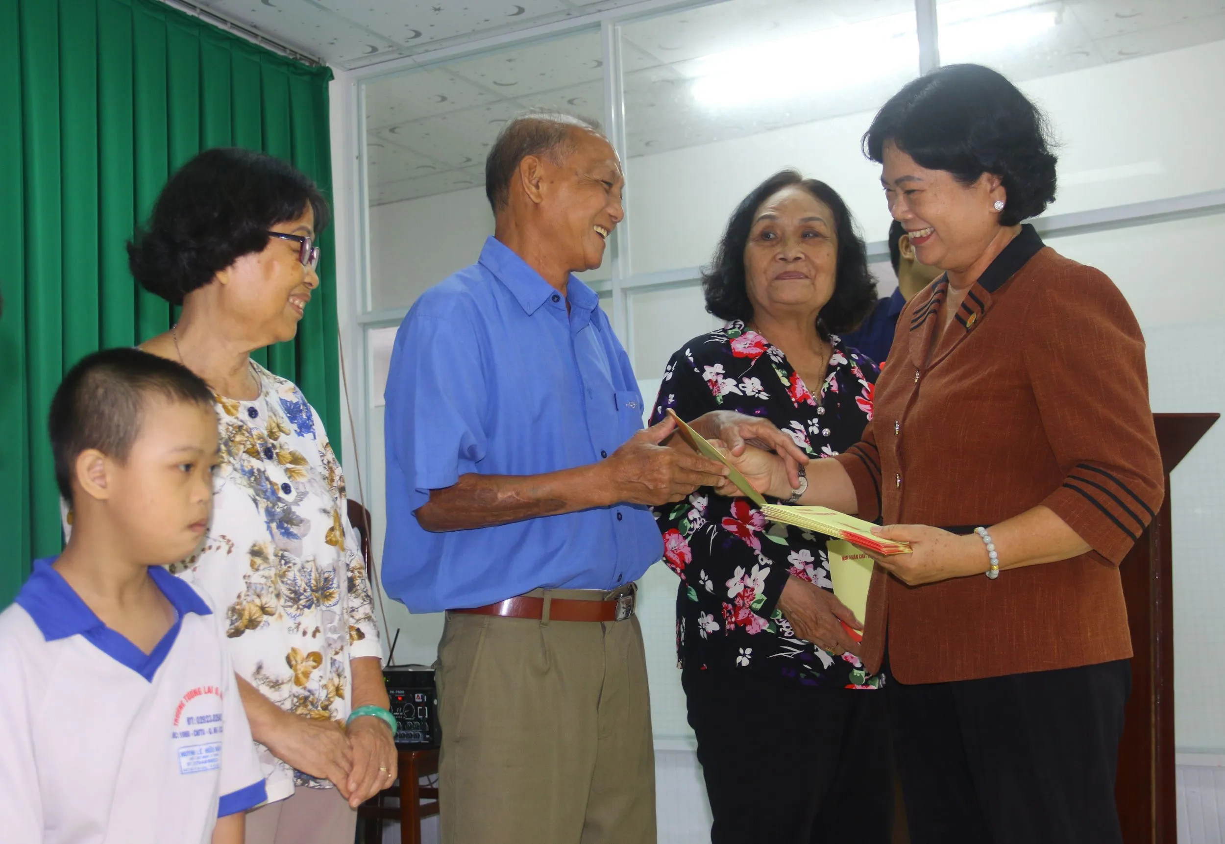 Bà Võ Thị Thanh Nga, Chủ tịch Hội NNCĐDC/ Dioxin TP Cần Thơ trao quà hỗ trợ những NNCĐDC có hoàn cảnh khó khăn.