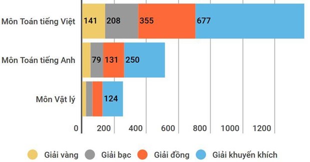 Trong đó, môn Toán tiếng Việt có số học sinh đoạt giải lớn nhất với gần 1.400 học sinh có giải, gồm 141 giải vàng, 208 giải bạc, 355 giải đồng, 677 giải khuyến khích.