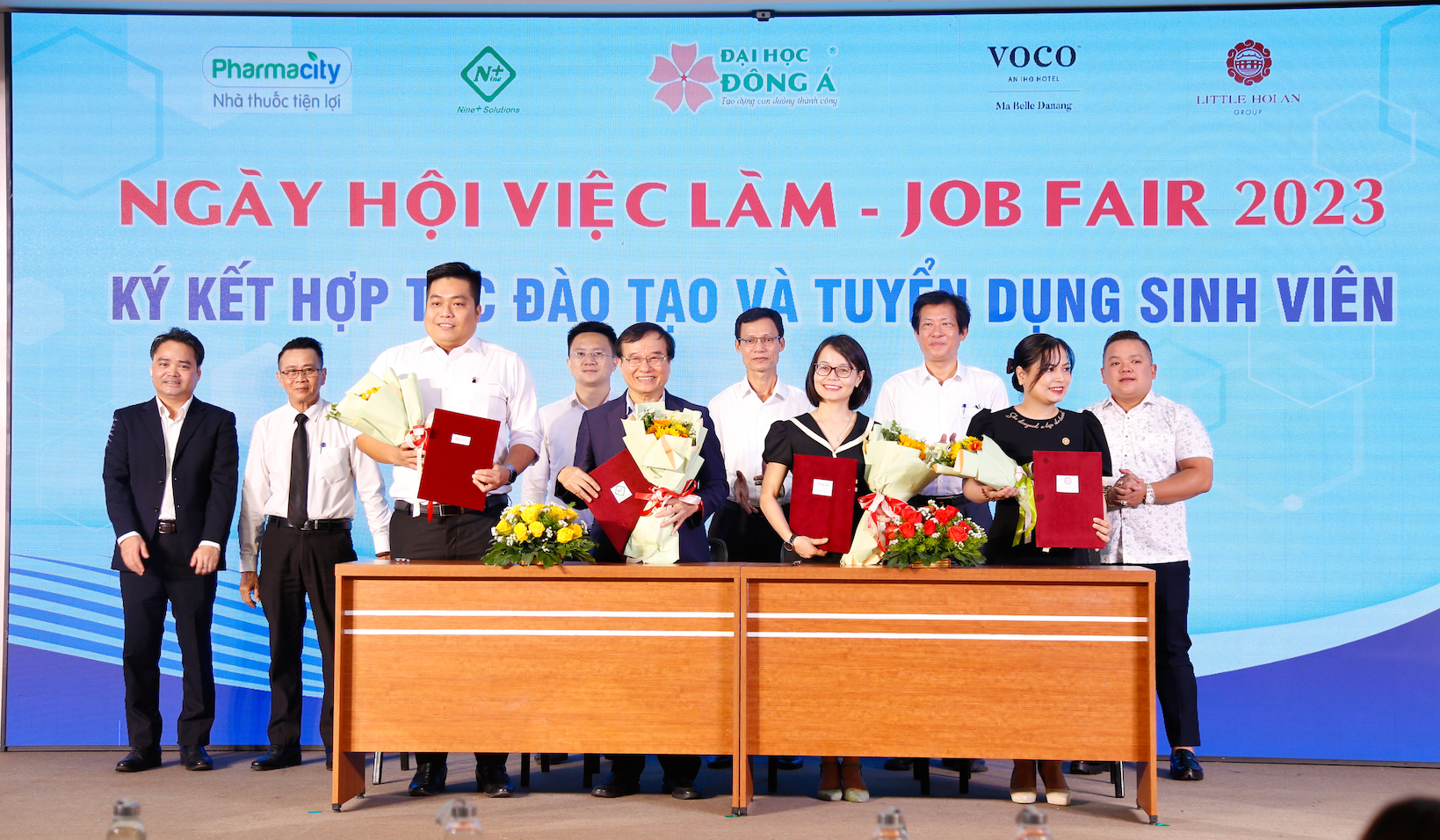 Tại phiên khai mạc Ngày hội việc làm 2023, Đại học Đông Á cũng ký kết thêm 4 doanh nghiệp tham gia vào chương trình hợp tác đào tạo và cung ứng nhân sự, gồm: voco Ma Belle Danang, Công ty TNHH Đại Phát Hội An, Công ty CP đầu tư và phát triển giải pháp công nghệ Nine Plus, Pharmacity.