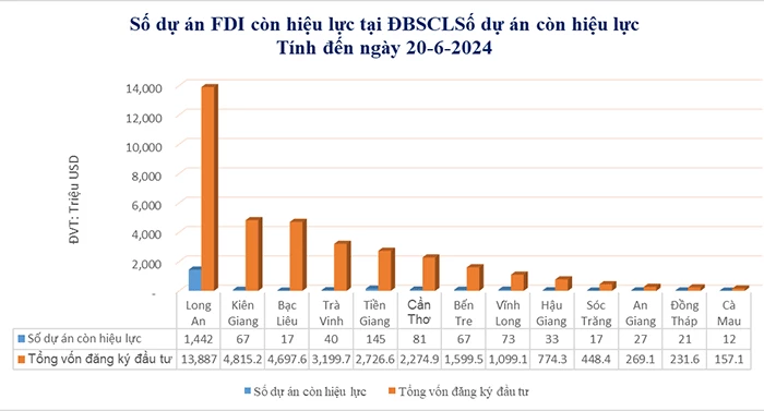 Tính đến ngày 20-6-2024, vùng ĐBSCL có 2.042 dự án FDI còn hiệu lực, tổng vốn đăng ký hơn 36,18 tỉ USD. Về vốn FDI đăng ký đầu tư, vùng có 8 địa phương có vốn FDI từ 1 tỉ USD trở lên. Trong đó, Long An là địa phương dẫn đầu vùng về số dự án và vốn đăng ký, với 1.442 dự án và vốn đăng ký trên 13,88 tỉ USD. Vốn FDI đăng ký xếp thứ 2 vùng là tỉnh Kiên Giang, với hơn 4,81 tỉ USD, kế đến là tỉnh Bạc Liêu với trên 4,69 tỉ USD, Trà Vinh xếp thứ 4 với hơn 3,19 tỉ USD, vị trí thứ 5 là tỉnh Tiền Giang hơn 2,72 tỉ USD, TP Cần Thơ đứng thứ 6 về vốn đăng ký, với hơn 2,27 tỉ USD. Tỉnh Bến Tre xếp thứ 7 với hơn 1,59 tỉ USD, vị trí thứ 8 là tỉnh Vĩnh Long với hơn 1,09 tỉ USD.