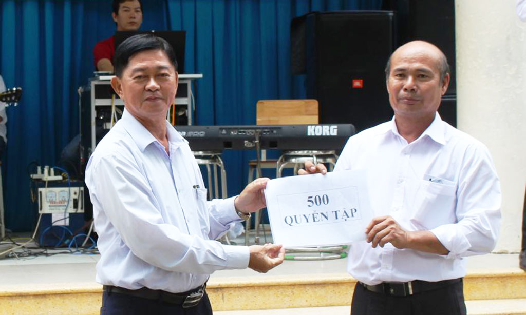 Phó Chủ tịch Hội khuyến học tỉnh – Võ Lê Tuấn tặng 500 quyển tập cho trường