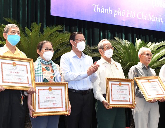 | Chủ tịch UBND TPHCM Phan Văn Mãi tặng bằng khen cho các cá nhân và tập thể. (Ảnh: Việt Dũng/sggp.vn). |