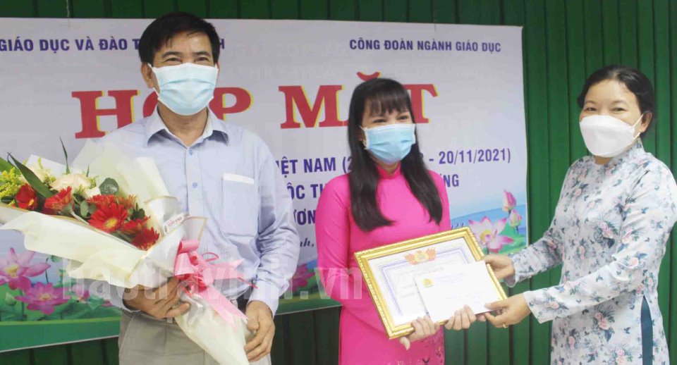 Bà Bùi Thị Rảnh, Chủ tịch Công đoàn ngành Giáo dục trao giấy khen cho cô Thạch Thị Phắt (Trường Phổ thông Dân tộc nội trú THPT tỉnh) đạt giải Ba Cuộc thi và tặng hoa cho nhân vật trong bài dự thi.