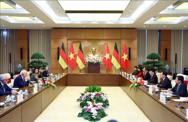 Chủ tịch Quốc hội bày tỏ vui mừng và tự hào về thành quả hợp tác to lớn, toàn diện đạt được sau gần 50 năm thiết lập quan hệ ngoại giao và hơn một thập kỷ thiết lập quan hệ Đối tác chiến lược. Quan hệ Việt Nam - Đức đang phát triển mạnh mẽ hướng tới tương lai tươi sáng. Chủ tịch Quốc hội đề nghị Tổng thống ủng hộ hai bên tăng cường hợp tác Nghị viện; phối hợp tổ chức các hoạt động có ý nghĩa nhân kỷ niệm 50 năm quan hệ ngoại giao vào năm 2025; thúc đẩy hợp tác chặt chẽ và ủng hộ lẫn nhau tại các diễn đàn đa phương.