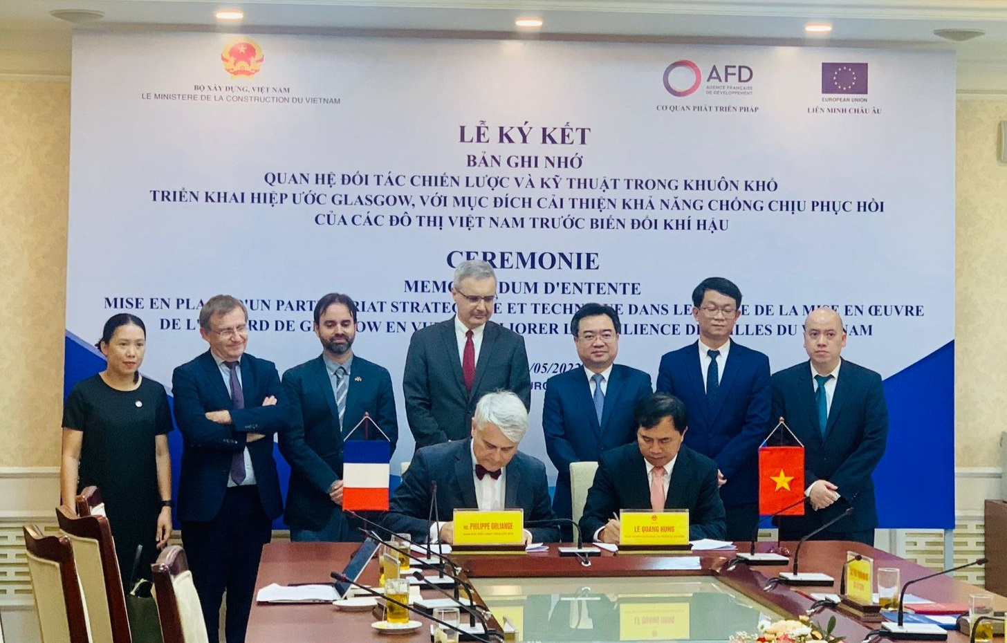 | Bộ Xây dựng Việt Nam và Cơ quan Phát triển Pháp ký bản ghi nhớ hợp tác về đẩy mạnh hợp tác nhằm hỗ trợ cho các đô thị Việt Nam tăng cường khả năng chống chịu và phục hồi trước biến đổi khí hậu và thiên tai (Ảnh: ĐSQ Pháp) |
