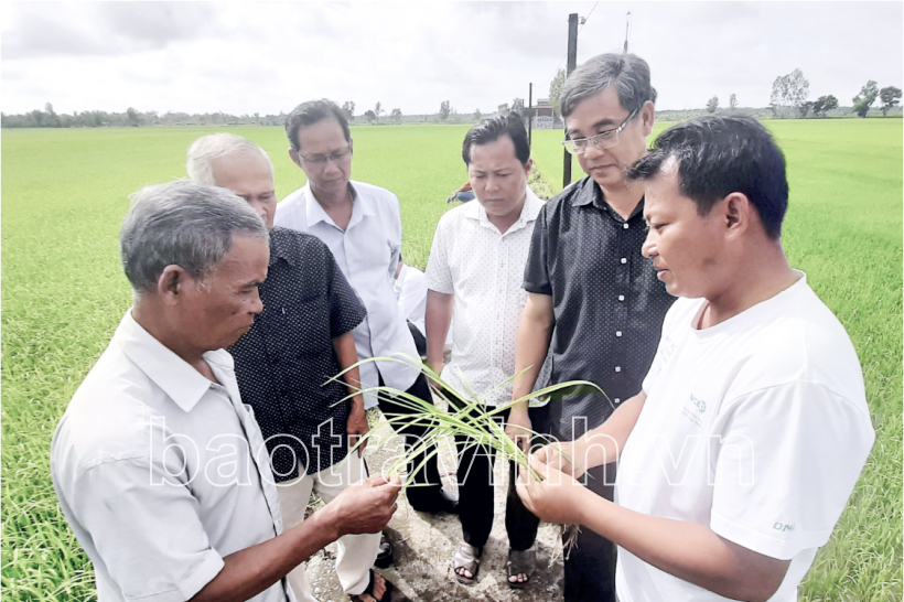 Lãnh đạo Liên minh HTX tỉnh và thành viên HTX nông nghiệp Rạch Lọp kiểm tra lúa thu - đông.