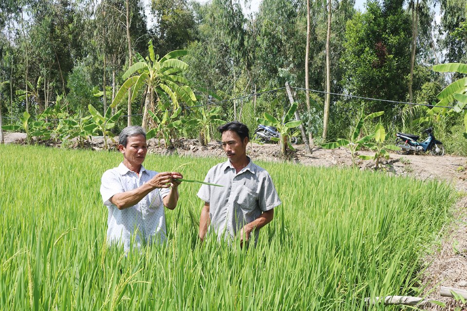 Ông Nguyễn Minh Vạn (bìa trái) - Chủ tịch Hội đồng quản trị kiêm Giám đốc Hợp tác xã nông nghiệp Tân Thuận Phát thăm ruộng canh tác giống lúa Hương Cửu Long kháng sâu bệnh của thành viên hợp tác xã.