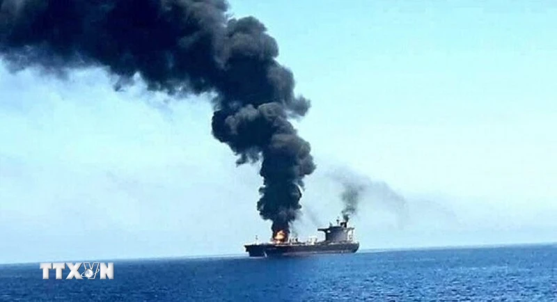 Một tàu bị lực lượng Houthi tấn công trên Biển Đỏ. (Ảnh: IRNA/TTXVN)