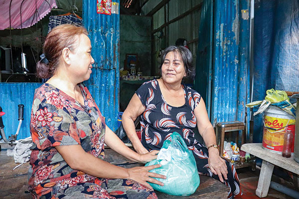 Sau cơn mưa lớn, nền nhà của cô Huỳnh Thị Kim Nương, ở khu vực Thới An 1, phường Thuận An, bị ngập lênh láng. Một phần vì nền nhà của cô thấp so với những ngôi nhà xung quanh lại không có lối thoát nước, phần vì mái nhà xuống cấp, dột nát. Năm nay, cô Nương đã 66 tuổi nhưng phải nuôi đứa cháu đang học lớp 3 và 2 con trai mắc bệnh hiểm nghèo. Cố gắng nhận việc làm thuê nhưng do sức yếu nên thu nhập của cô và con trai không được bao nhiêu, phải nhờ vào sự sẻ chia của hàng xóm láng giềng. Nhận túi gạo từ sự đóng góp của nhiều hội viên phụ nữ trong Chi hội Phụ nữ khu vực, cô Nương không giấu được xúc động. Cô bày tỏ: "Nhờ chính quyền địa phương quan tâm, sự động viên, san sẻ của chị em phụ nữ trong Chi hội, tôi có thêm động lực để tiếp tục chăm sóc sức khỏe cho con, cháu". Cô Nương vui mừng khi được biết UBND phường đang xét hỗ trợ xây nhà mới để gia đình cô an cư.