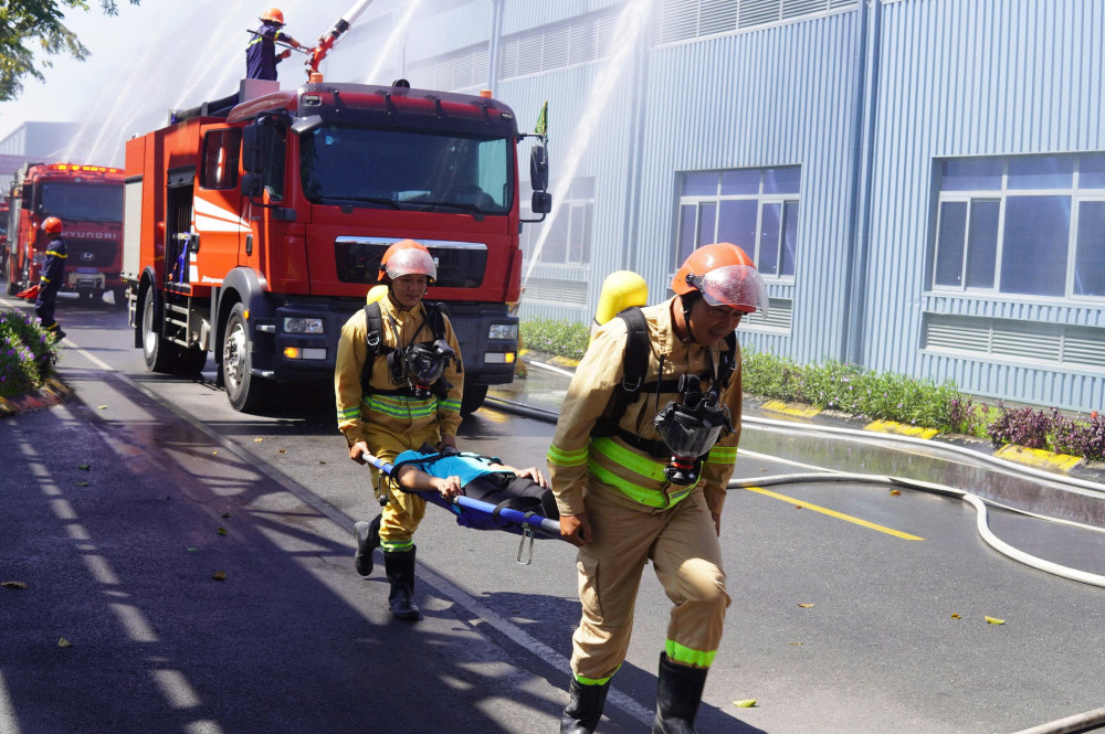Sau buổi huấn luyện, Đội chữa cháy và CNCH khu vực Gò Dầu tiếp tục phối hợp Công ty Cổ phần đầu tư Sài Gòn VRG, Đồn Công an Khu công nghiệp Phước Đông tổ chức thực tập phương án chữa cháy và CNCH tại Công ty TNHH JINYU Việt Nam TIRE.