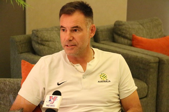 Huấn luyện viên U19 Australia trả lời phỏng vấn của phóng viên. (Ảnh: Hải Ngọc/Vietnam+)