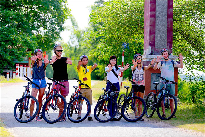 | Du khách quốc tế hào hứng khi đạp xe tham quan Huế (Ảnh: Sở Du lịch tỉnh Thừa Thiên Huế cung cấp) |