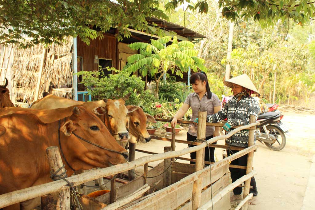 Bà Nguyễn Thị Hà (bìa phải), ngụ ấp Hưng Tân từng là hộ nghèo, được chính quyền địa phương hỗ trợ vay vốn chăn nuôi bò, hiện gia đình đã thoát nghèo và có cuộc sống ổn định