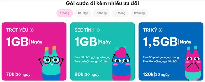 - TRI KỶ ME120: cước phí 120,000đ/tháng nhận 1,5GB data/ngày, miễn phí cuộc gọi nội mạng <10 phút và miễn phí 50 phút gọi ngoại mạng.