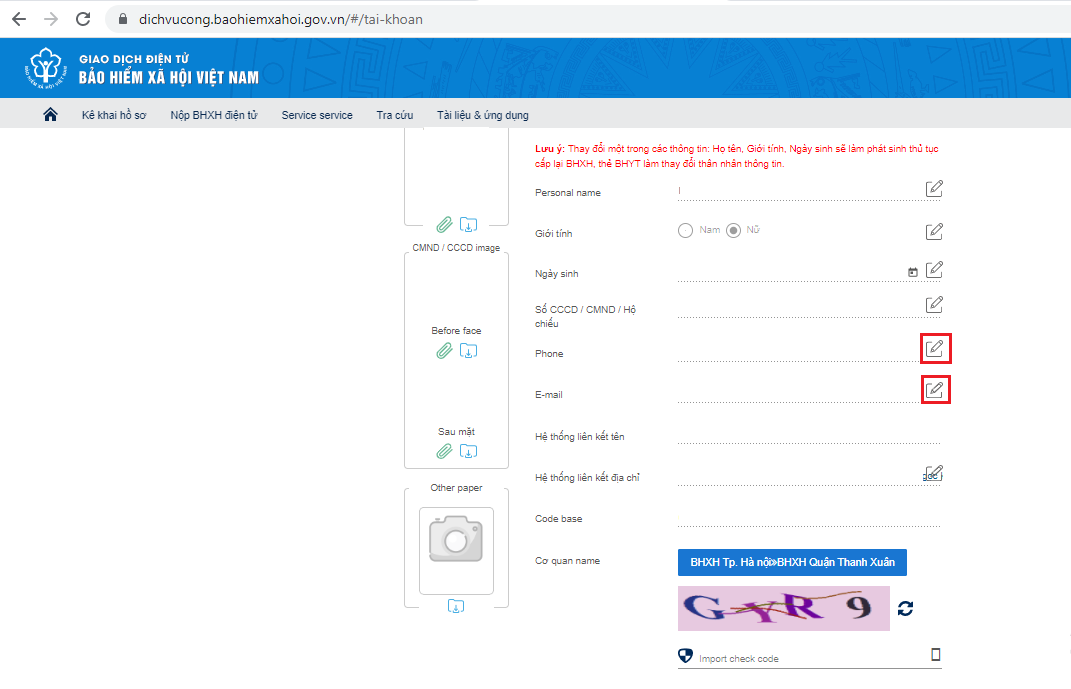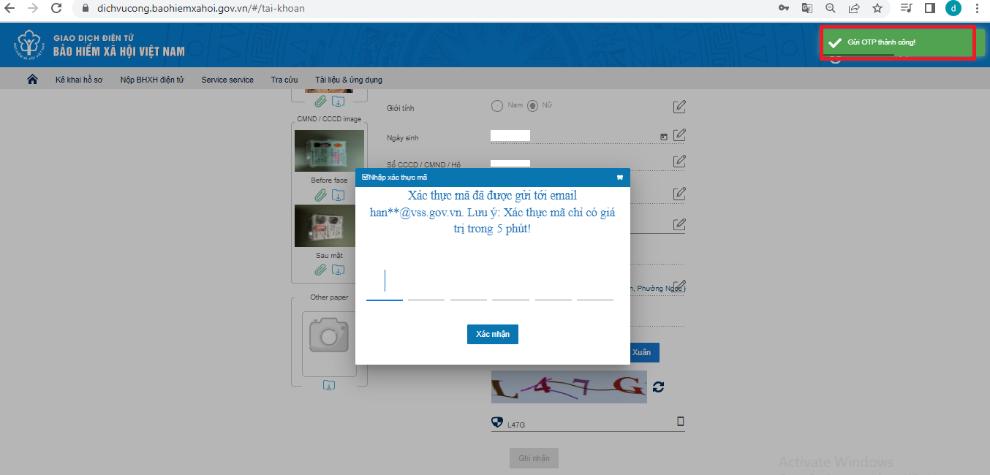Bước 3: Sau khi điền thông tin số điện thoại, email cần cập nhật, thay đổi tại các mục tương ứng, người dùng tiếp tục nhập mã kiểm tra và chọn “Ghi nhận”, nhập mã xác thực (OTP) được gửi về địa chỉ email đã đăng ký (hoặc email được cập nhật), nhấn “Xác nhận” để hoàn tất quá trình cập nhật, thay đổi thông tin./.