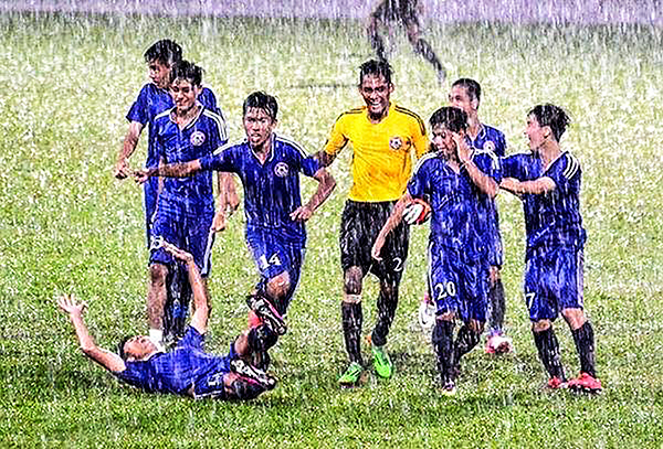 Hữu Hậu (giữa) mừng chiến thắng cùng các đồng đội sau chiến thắng trước U19 Đồng Tháp ở vòng loại giải U19 quốc gia năm 2017. Ảnh: NVCC