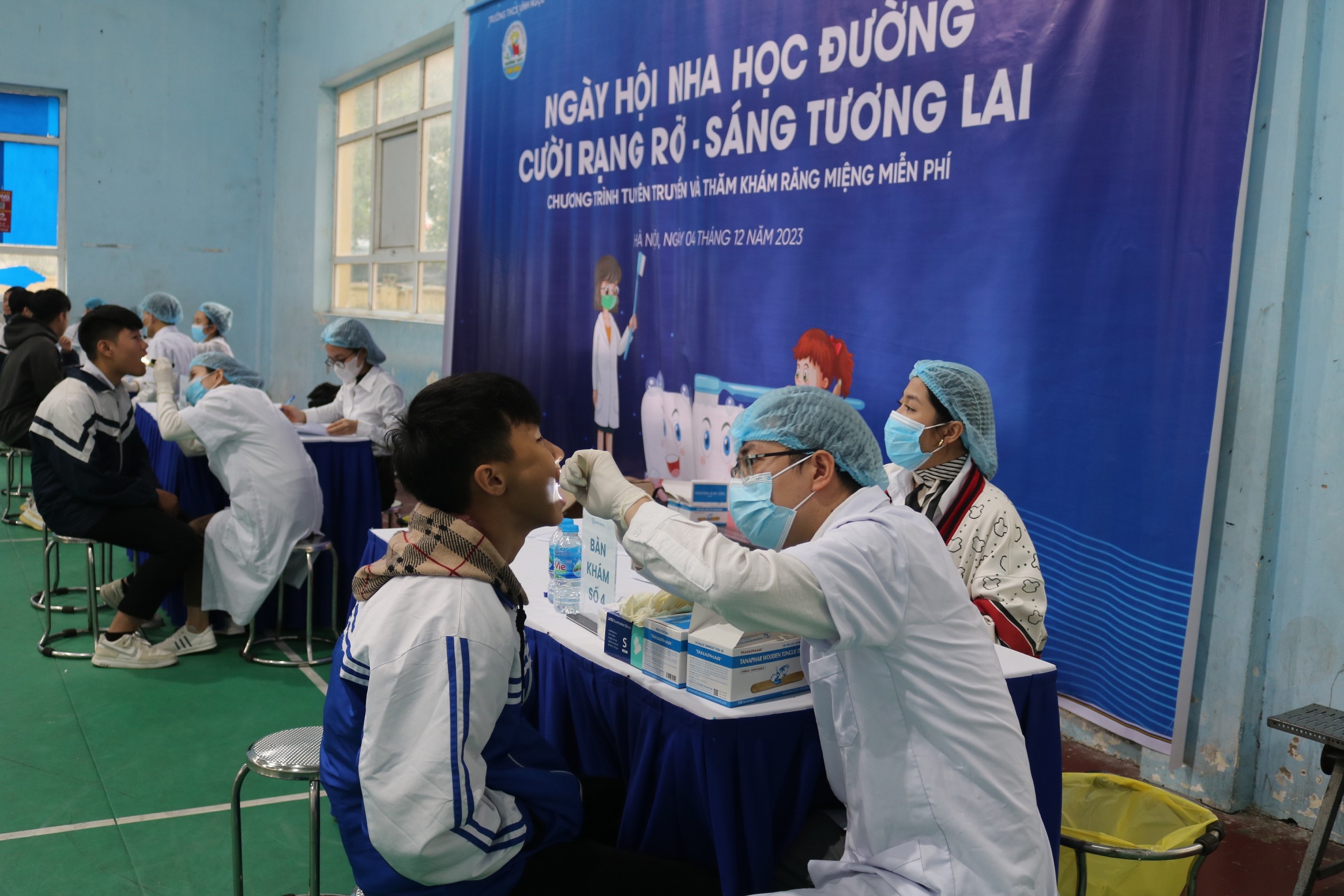 | Đội ngũ bác sỹ thăm khám, tư vấn chăm sóc sức khỏe răng miệng cho học sinh. |