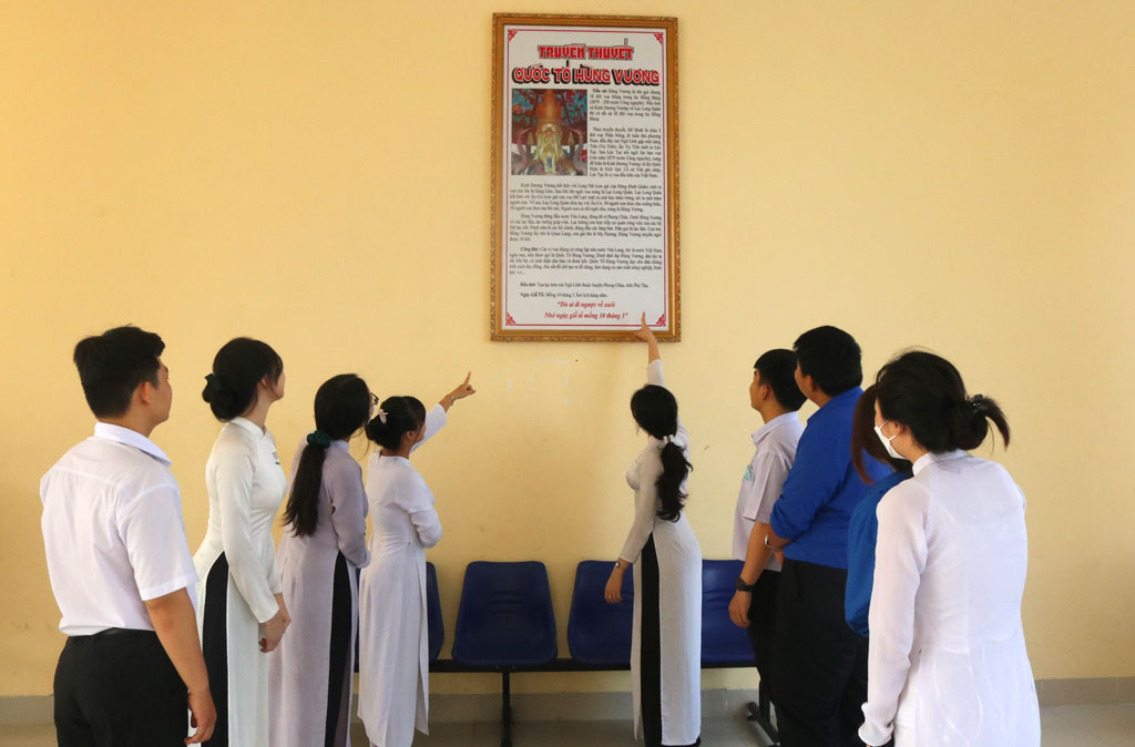 Học sinh Trường THPT Hùng Vương (TP.Tân An) tìm hiểu truyền thuyết Quốc Tổ Hùng Vương để hiểu hơn về cội nguồn dân tộc