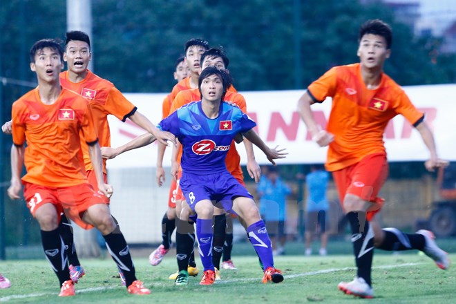 Tuấn Anh đơn độc trong vòng vây các cầu thủ U19 Việt Nam. (Ảnh: Minh Chiến/Vietnam+)
