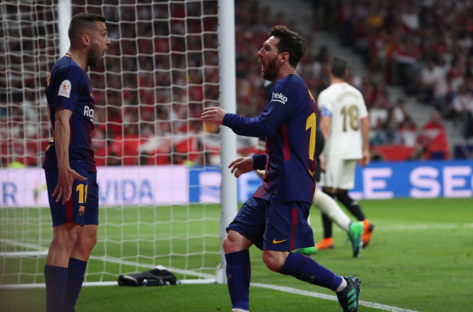 Messi ăn mừng bàn thắng với Alba. Ảnh: Reuters
