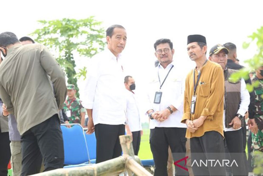 Tổng thống Joko Widodo trong một hoạt động trồng lúa với Bộ trưởng Nông nghiệp Syahrul Yasin Limpo ở Tuban, Đông Java, ngày 6/4. (Nguồn: Antara)