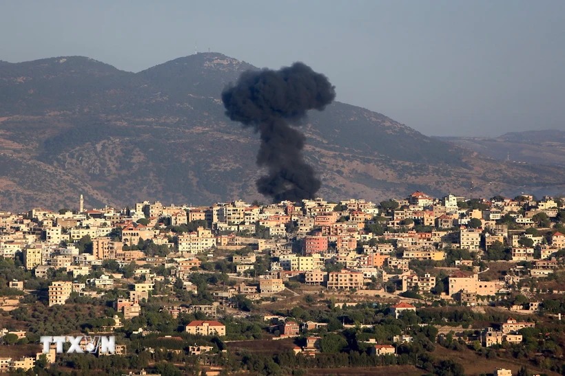 Khói bốc lên sau cuộc pháo kích của Israel xuống Khiam, Liban ngày 23/8. (Ảnh: THX/TTXVN)