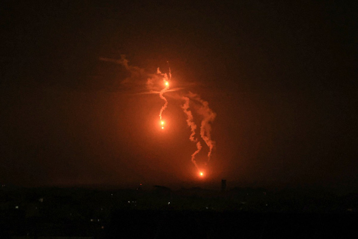 Pháo sáng của Israel đỏ rực trên bầu trời thành phố Khan Younis, Gaza tối 2/12 - Ảnh: AFP