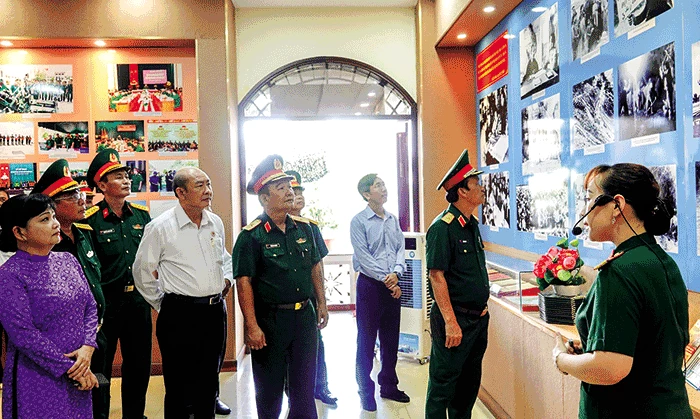 Đại biểu và khách tham quan xem triển lãm tại Bảo tàng Quân khu 9.