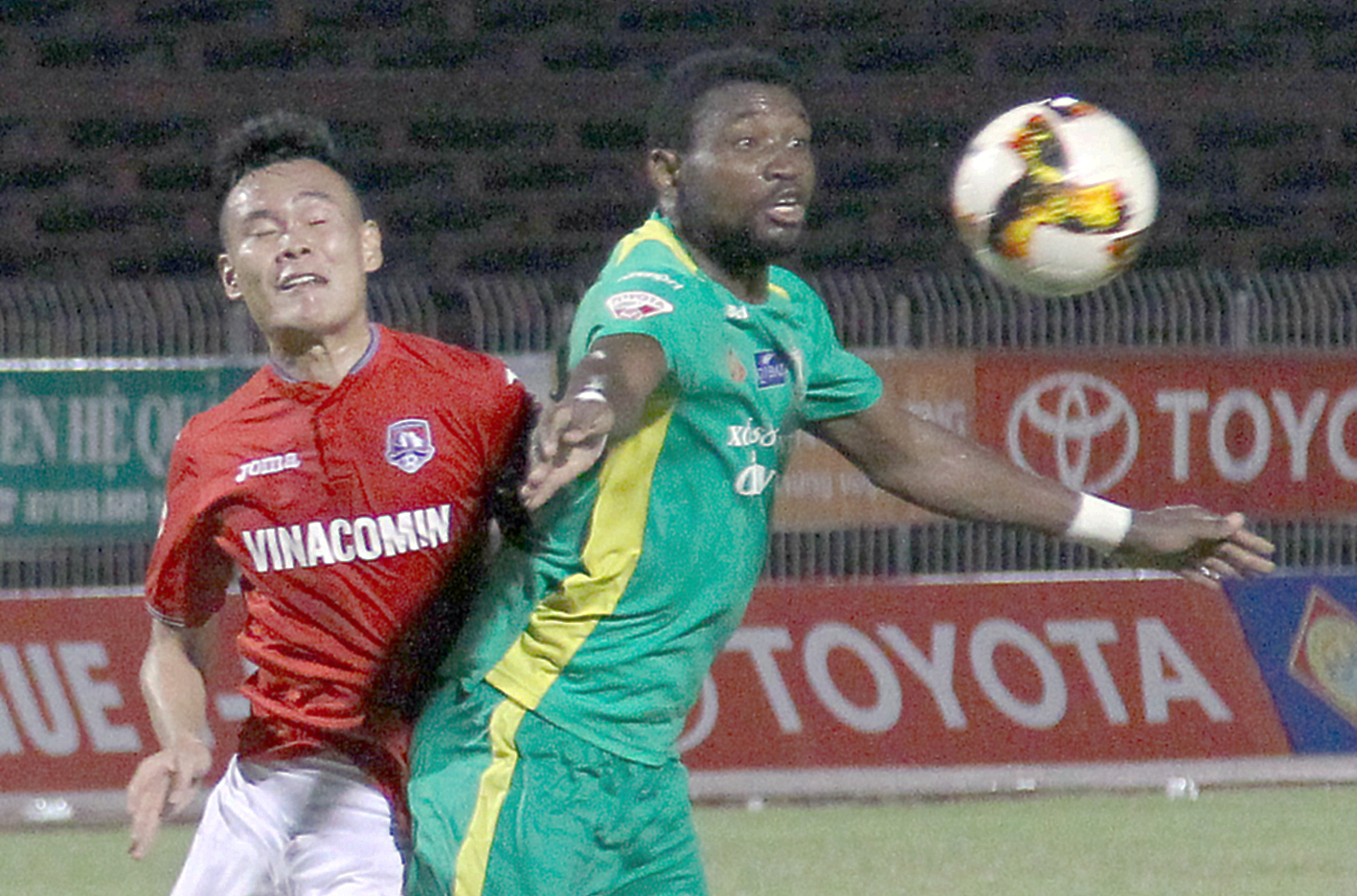 Cuộc đối đầu giữa cầu thủ Than Quảng Ninh (trái) và XSKT Cần Thơ. Ảnh: NGUYỄN MINH