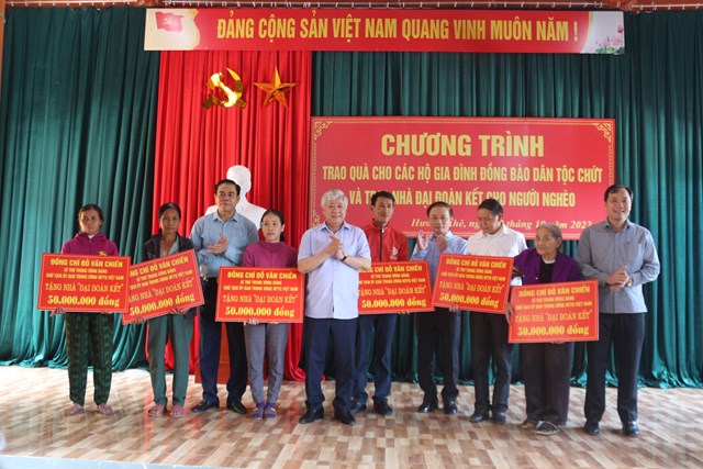| Bí thư Trung ương Đảng, Chủ tịch Ủy ban Trung ương MTTQ Việt Nam Đỗ Văn Chiến trao biển tượng trưng tặng nhà đại đoàn cho hộ nghèo ở Hà Tĩnh. |