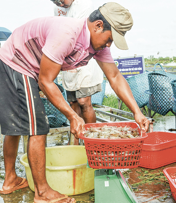 Thu hoạch tôm nuôi bằng chế phẩm sinh học tại huyện Vĩnh Châu, tỉnh Sóc Trăng. Ảnh: MỸ THANH
