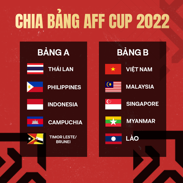 Theo đó, đội tuyển Việt Nam nằm ở bảng B cùng với Malaysia, Singapore, Myanmar và Lào tại AFF Cup 2022. Trong khi đó, bảng A gồm Thái Lan, Philippines, Indonesia, Campuchia và đội thắng ở vòng loại giữa Timor Leste với Brunei.