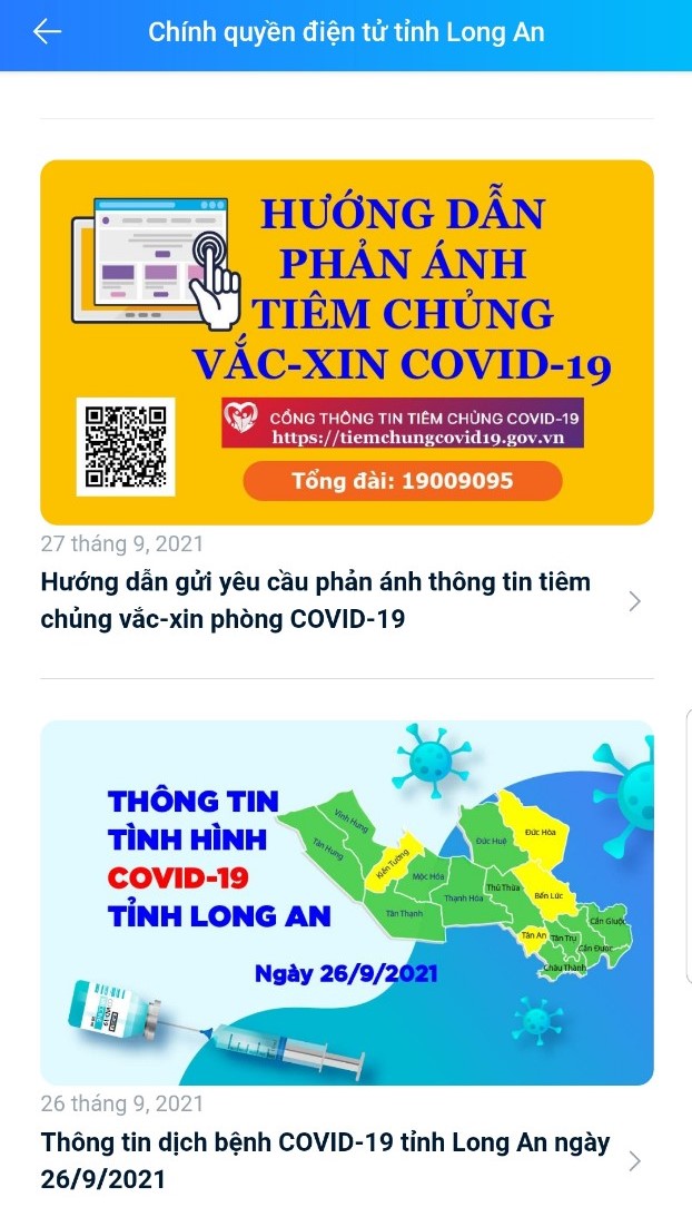 Bên cạnh đó, từ khi dịch bùng phát đến nay, tiểu ban thông tin, truyền thông và công nghệ, Ban chỉ đạo phòng, chống dịch COVID-19 tỉnh còn cập nhật thường xuyên thông tin về tình hình dịch bệnh trên địa bàn tỉnh trang Zalo Chính quyền điện tử tỉnh Long An để cung cấp thông tin kịp thời, chính thống đến từng người dân.