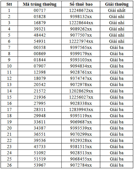 Ghi chú: Hai số cuối của số điện thoại trúng thưởng không được ghi cụ thể để tránh các trường hợp làm phiền khách hàng có thể phát sinh.