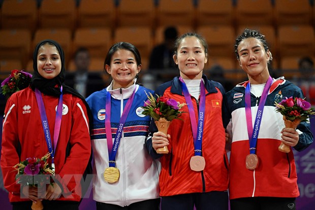 Vận động viên Phùng Thị Huệ (thứ 2, phải) giành Huy chương Đồng môn Jujitsu hạng 48kg Nữ tại ASIAD 2023 ở Hàng Châu (Trung Quốc) ngày 5/10/2023. (Ảnh: AFP/TTXVN)