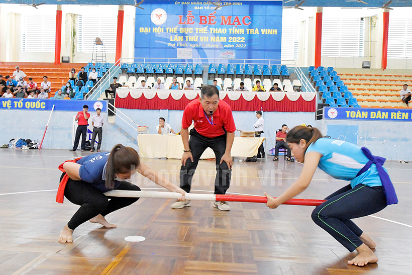 Theo đó, giải đẩy gậy tranh tài 10 hạng cân nam và 03 hạng cân nữ. Kết quả Ban tổ chức trao 13 bộ huy chương cho các vận động viên xuất sắc; trong đó, các Huy chương Vàng được trao cho 10 vận động viên nam gồm: Thạch Ngọc Hoàng (54 - 57kg), Trần Trung (57 - 60kg), Thạch Ngọc Mai (60 - 63kg), Thạch Hoàng Phúc (66 - 69kg), Huỳnh Văn Nghiêm (69 - 72kg), Nguyễn Hoài Linh (72 - 75kg) cùng đơn vị Châu Thành; Thân Trọng Trí (63 - 66kg), đơn vị Công an tỉnh; Thạch Thuận (75 - 80kg), thành phố Trà Vinh; Huỳnh Thanh Xuyên (80 - 85kg); Dương Gian (trên 90kg) cùng huyện Tiểu Cần.