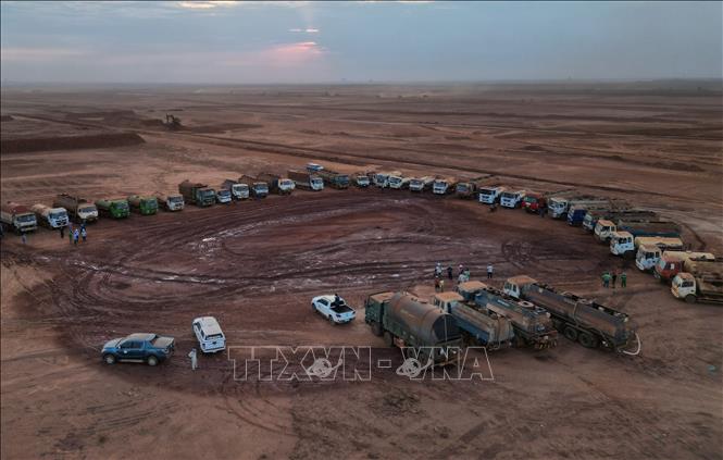 | Hàng chục xe bồn phục vụ tưới nước tại sân bay Long Thành. Ảnh: Công Phong/TTXVN |