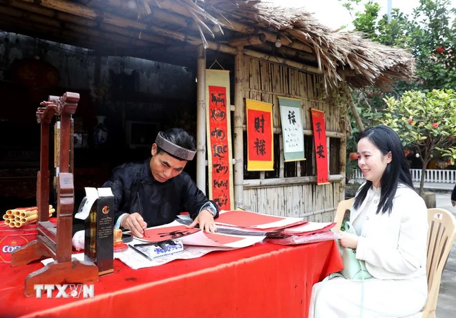Xin chữ đầu năm tại Lễ hội chùa Keo mùa Xuân năm Bính Ngọ 2026. (Ảnh: Thế Duyệt/TTXVN)