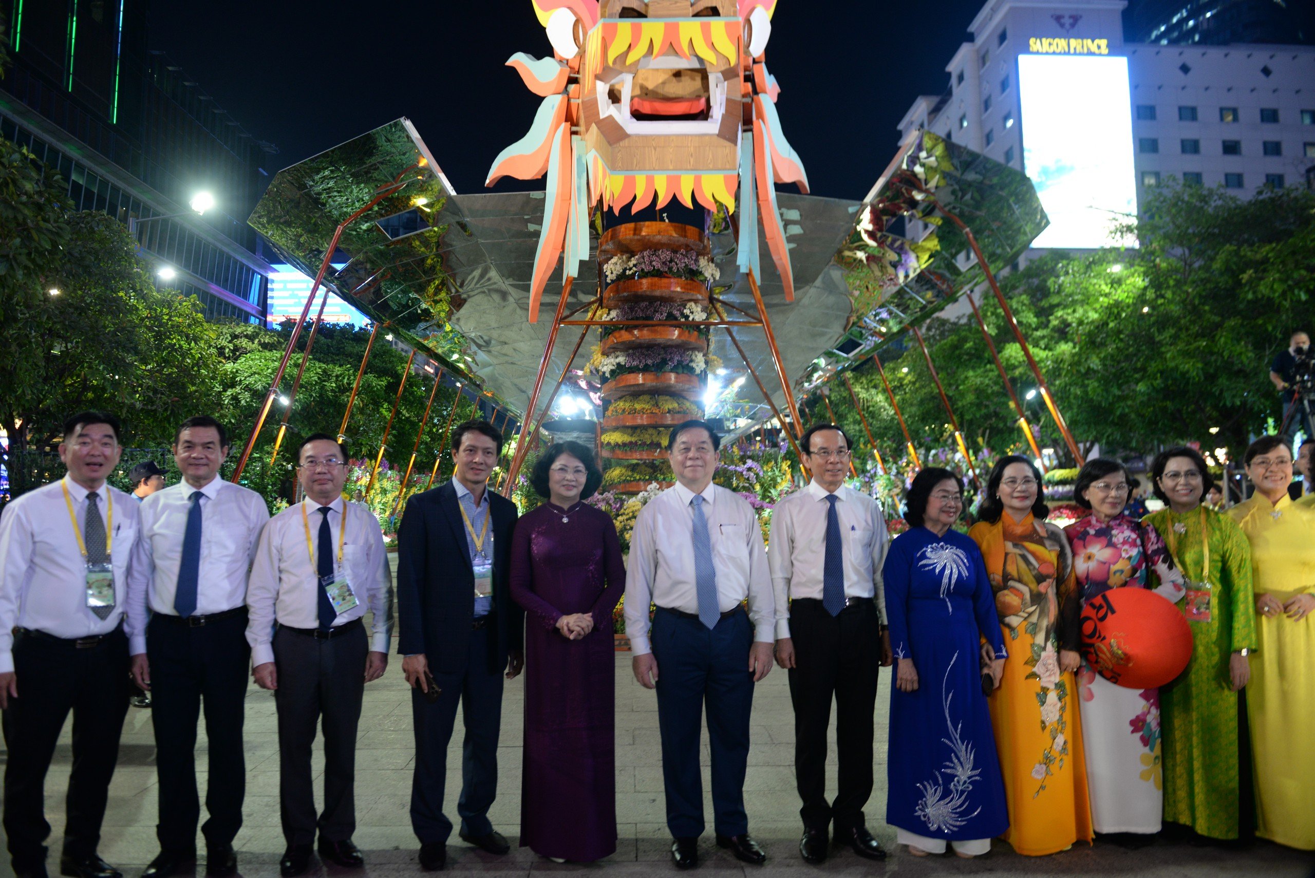 | Các đồng chí lãnh đạo chụp ảnh lưu niệm tại Đường hoa Nguyễn Huệ Tết Giáp Thìn 2024. |