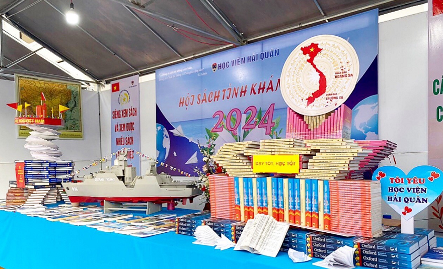 | Không gian trưng bày với nhiều sách về biển, đảo quê hương của Học viện Hải quân |